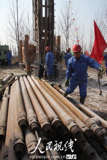 2月15日,山東省地礦局水文地質工程地質大隊的工人在嚴重缺水的臨沂市沂南縣青駝鎮桃花埠村打井。