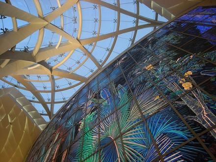 被切割開來的小玻璃,最后拼裝起來,組成了《生命之源》。16米高的壁畫上,匯集了30萬塊切割成各種形狀的小塊彩色玻璃。為了讓作品看起來更通透,彩色玻璃貼在了半透明的無色玻璃上。