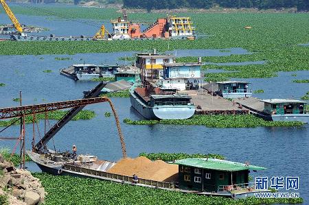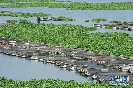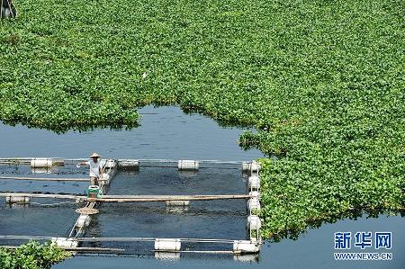福建閩江被水葫蘆包圍的養殖區。為保護閩江水資源,加大整治水葫蘆力度, 一場“清剿”水葫蘆大戰近日在福建閩江水口電站大壩前拉開。從4月份入汛以來,隨著氣溫升高,水葫蘆在閩江水口電站上游瘋長,目前,往下游漂流的水葫蘆,覆蓋了閩江水口電站大壩近10公里水面,瘋長的水葫蘆給閩江水質、行洪、航運、養殖等方面都造成了不同程度的影響。由于水葫蘆的繁殖能力很強,正常生長期的水葫蘆每10-15天面積就能翻一番,因此治理難度很大。2003年,福建打響了葫蘆“殲滅戰”,雖然取了得階段性成果,但水葫蘆在閩江泛濫問題仍得不到根治,現已成為水利管理的一大難題.
