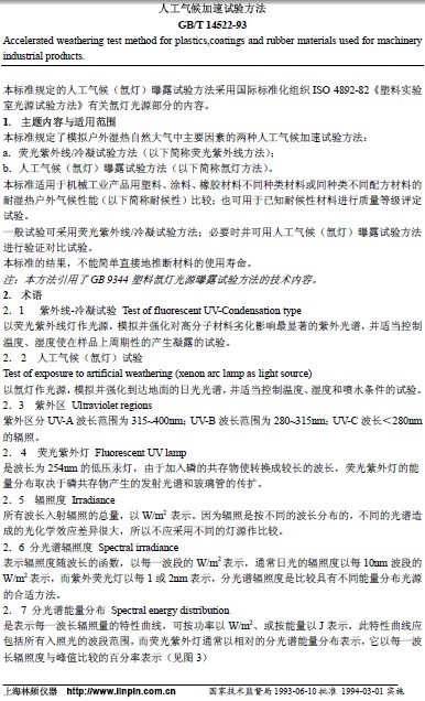 GB/T 14522-93 機械工業產品人工氣候加速試驗方法:http://m.yx38800.com/uploadFile/softdown/2008103142102365.pdf