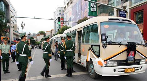 9月26日上午,因救人被江水卷走的武警戰(zhàn)士劉先東、楊磊的追悼會(huì)在攀枝花市中心廣場(chǎng)舉行。運(yùn)有兩名武警戰(zhàn)士骨灰的車(chē)輛從武警攀枝花支隊(duì)第三中隊(duì)出發(fā),駛往攀枝花市中心廣場(chǎng),沿途上萬(wàn)群眾護(hù)送兩名戰(zhàn)士。中午12時(shí)許,在家人的陪同下,劉先東、楊磊“乘坐”K118次列車(chē)回家。