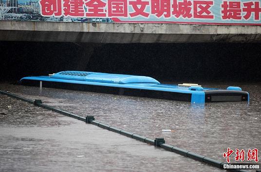 7月26日,突襲津城的大到暴雨致使天津塘沽河北路地道被淹,積水超過2米。圖為一輛駛入地道的公交車被積水淹沒。 據媒體報道,天津市氣象臺26日發布兩次暴雨橙色預警信號。 自25日晚至26日,天津市區普降大到暴雨。受大雨影響,天津市內已經有多處積水涵洞實行了交通管制,禁止車輛通行。天津衛津路、紅旗路、六緯路等主干線也出現了積水的情況,積水15-20公分,車輛通行緩慢,交管局接到了很多車輛因為在水中熄火停滯的報警。天津市交通管理部門已經啟動惡劣天氣緊急預案,對全市125個積水點位,28個預積水低片,54個涵洞增派警力。交管部門表示,如果發現積水過深將采取交通管制,予以分流的措施。