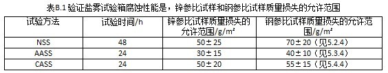 最新鹽霧試驗(yàn)箱GBT10125-2012標(biāo)準(zhǔn)【附錄B】下 B.3 質(zhì)量損失的測(cè)定、 試驗(yàn)結(jié)束后,立即去除報(bào)不行涂層,然后按照ISO 8407的規(guī)定反復(fù)清洗,去除腐蝕產(chǎn)物,化學(xué)清洗方法如下: 在1000mL去離子水中加入250g±5g的C2H5NO2(p.a.)配成飽和氨基乙酸溶液。 化學(xué)清洗工序最好重復(fù)浸泡5min,每次浸泡后應(yīng)在室溫下用流動(dòng)水輕輕刷洗試樣,用丙酮或乙醇清洗。干燥后稱重,參比試樣稱重精確到±1mg。按ISO 8407中所述繪制試樣質(zhì)量隨清洗次數(shù)的變化曲線。 注:為了在浸泡過(guò)程中更有效的溶解腐蝕產(chǎn)物,可以攪動(dòng)清洗液,最好使用超聲清洗。 按照ISO8407標(biāo)準(zhǔn)規(guī)定,從質(zhì)量隨清洗次數(shù)變化曲線上可以得到去除腐蝕產(chǎn)物后的試樣的真是質(zhì)量,用參比試樣試驗(yàn)前質(zhì)量減去試驗(yàn)后去除腐蝕產(chǎn)物后的試樣質(zhì)量,再除以參比試樣的有效試驗(yàn)面積,計(jì)算得出參比試樣沒(méi)平方米的質(zhì)量損失。 B.4 試驗(yàn)儀器運(yùn)行良好 每塊鋼參比試樣和鋅參比試樣的質(zhì)量損失如在規(guī)定范圍內(nèi)(見(jiàn)表B.1),則認(rèn)為鹽霧試驗(yàn)箱運(yùn)行良好。