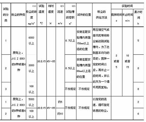 塵埃試驗,在試驗槽中進行。但是,過去來自各種國內(nèi)外標(biāo)準(zhǔn)的各種規(guī)定采用了各種各樣的試驗槽尺寸,而且,粉塵的供給方法、攪拌條件都?xì)埲辈蝗L貏e是針對浮游試驗所進行的確認(rèn)試驗結(jié)果表明,試驗槽內(nèi)的粉塵狀態(tài)即粉塵濃度的離散性很高,同一試驗裝置、同一試驗條件下所進行的試驗,其試驗結(jié)果不具有再現(xiàn)性。因此,為了避免出現(xiàn)這種含混不清的狀況,本標(biāo)準(zhǔn)規(guī)定了粉塵濃度(mg/m³)的最低值。