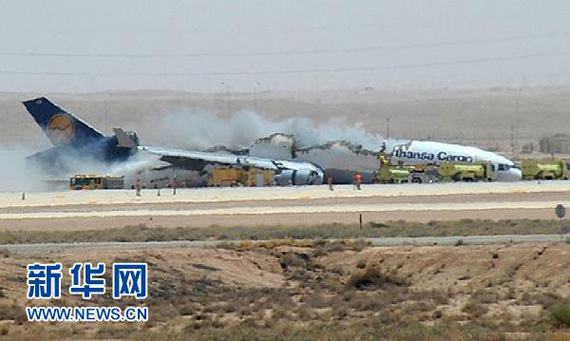 這張手機拍攝的照片顯示,德國漢莎航空公司一架貨機7月27日在沙特首都利雅得的哈立德國王國際機場墜毀。據阿拉伯衛星電視臺援引沙特民航局官員的話說,貨機駕駛員和副駕駛員已經被送往醫院搶救。目前尚不清楚貨機上具體人數。