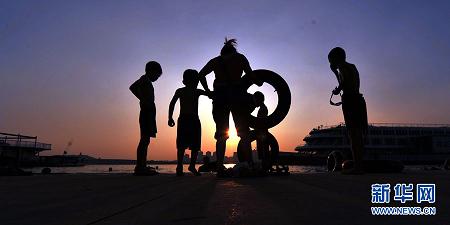 8月4日,幾名小朋友在湘江邊作戲水前的準備。當日,湖南省會長沙最高溫度達到40℃ ,為今年入夏以來的最高氣溫,湖南省氣象臺已發布今年首個高溫紅色預警信號。